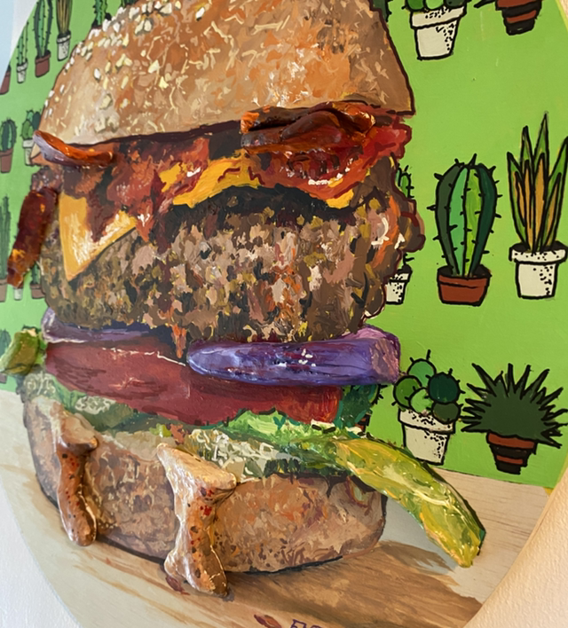 Acrylique sur planche de bois ronde + argile donnant le relief